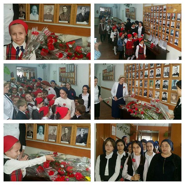 Торжественная церемония возложение цветов к стенду "Мы помним ваши имена", на котором размещены фотографии ветеранов, уроженцев поселка Алды. Мы обязаны помнить и чтить отважных сынов чеченского народа!