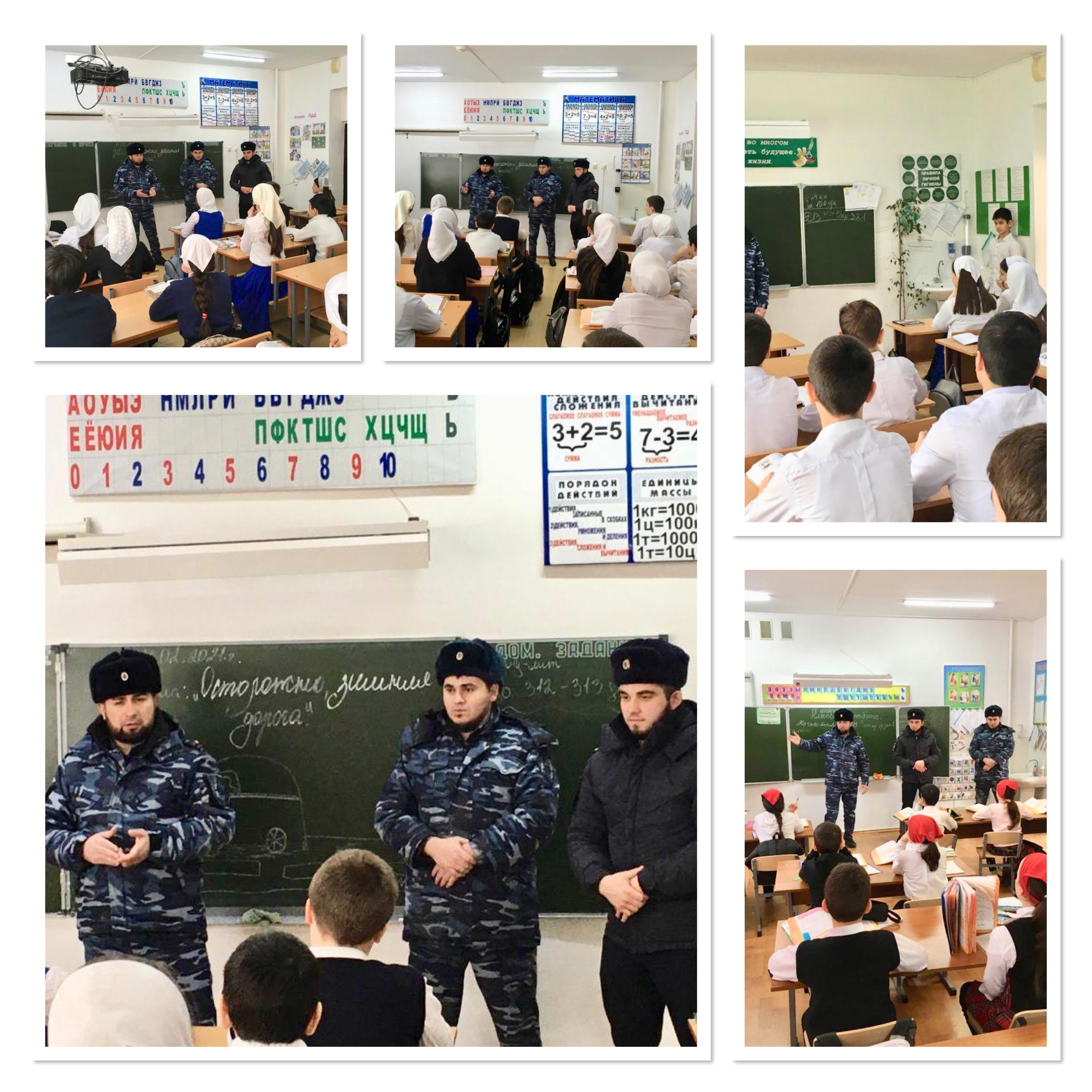 18 февраля состоялась встреча обучающихся с инспектором ПДН УМВД России майором полиции Гайсумовым М.Я., госинспектором ОГИ БДД УМВР России лейтенантом полиции Джабраиловым З.Т. и участковыми уполномоченными УМВД России по г. Грозный. Была проведена разъяснительная беседа по правилам безопасного поведения в зимний период. Выяснили, какую опасность таят зимние дороги и как себя обезопасить при движении по улицам в зимнее время года.