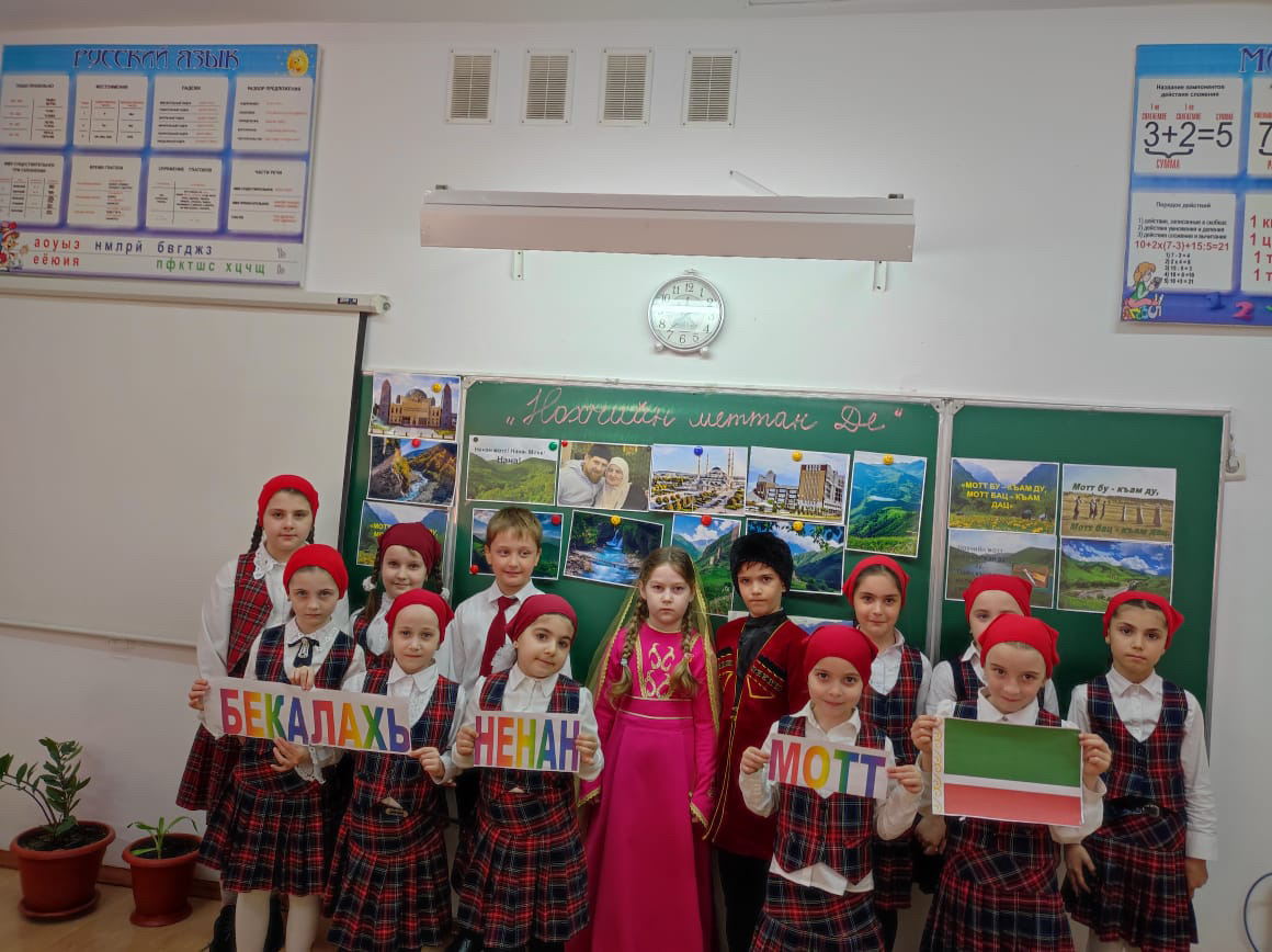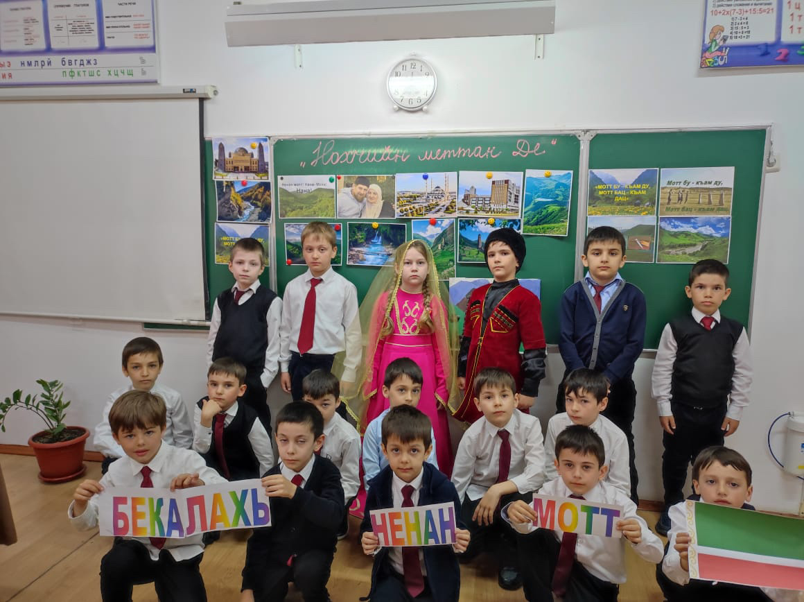 Учитель начальных классов Хамбураева З.А., в рамках проведения недели чеченского языка, провела в 1б классе мероприятие «Нохчийн маттан Де». Мероприятие было проведено с целью познакомить учащихся с историей установления праздничного дня. Зарета Алиевна отметила всю важность владения своим родным языком, дала представление о его необычайной красоте. Первоклассники читали стихи, посвященные родному языку.