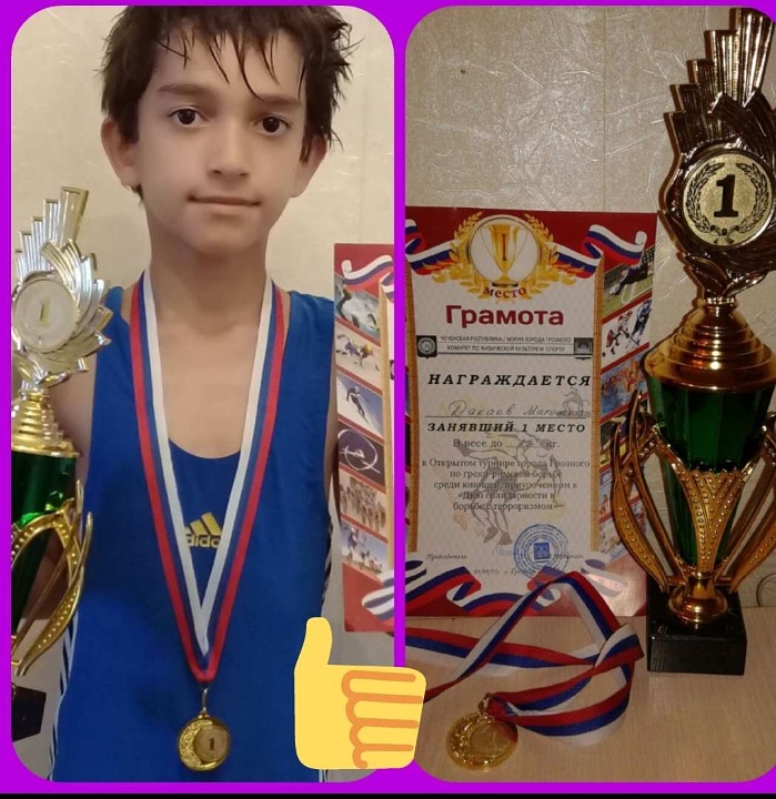 Дагаев Магомед, ученик 3е класса МБОУ '"СОШ №47" занял 1 место по греко-римской борьбе среди юношей в Открытом турнире города Грозного, приуроченному к "Дню солидарности в борьбе с терроризмом"