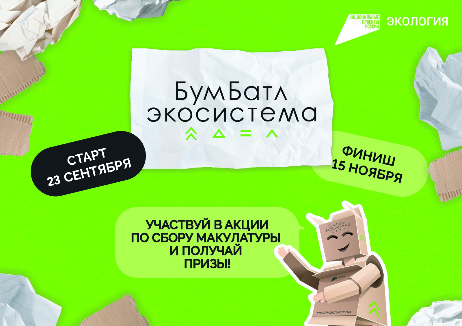 Юбилейный сезон акции «БумБатл» стартовал 23 сентября. В этом году масштабный экологический проект вновь проходит под эгидой Всероссийского экологического общественного движения «Экосистема» в поддержку нацпроекта «Экология». Ключевая цель акции – сокращение излишнего потребления бумаги и формирование культуры обращения с отходами. «Экологическое благополучие жителей России – одна из национальных целей, поставленных Президентом. И для достижения желаемых результатов будет реализован целый комплекс мер. В частности, к 2030 году необходимо обеспечить полную сортировку ТКО и полигонное захоронение не более половины из них, а также повторное вовлечение в оборот не менее четверти отходов производства и потребления. Важно, чтобы те проекты, которые реализует государство, находили отклик у граждан и были ими поддержаны. Такие акции ежегодно привлекают внимание к вопросу ответственного обращения с отходами все больше людей. Кроме того, сбор макулатуры – это сокращение потребления бумаги, а значит, важный шаг в сторону сохранения уникальных лесных экосистем России», – отметил вице-премьер РФ Дмитрий Патрушев. Принять участие в акции по сбору макулатуры может каждый житель страны. Побороться за лучший результат можно и вместе с семьей – в Год семьи для этого появилась отдельная номинация. По традиции, коллективный зачет проведут среди детских садов, школ, колледжей, вузов. Также бумагу будут сдавать представители крупных производственных предприятий, бизнеса и общественных организаций. Чтобы принять участие в акции «БумБатл», необходимо зарегистрироваться на сайте проекта бумбатл.рф. Коллективные заявки на участие принимаются с 23 сентября по 10 ноября. Побороться за первенство в индивидуальном зачете можно с 23 сентября по 15 ноября. При регистрации нужно указать организацию или подтвердить самостоятельное участие, выбрать на интерактивной карте ближайший пункт приема, отнести бумагу туда, получить акт о сдаче и загрузить его в личный кабинет. Участники, первыми сдавшие более пуда (16 килограммов) макулатуры в специальных пунктах приема, получат возможность обменять его на билет в театр, музей, на спортивное или другое мероприятие в своем регионе. Победители в категориях «вузы» и «колледжи» приедут на экскурсию в «зеленый офис» партнера проекта в Москве, лидеры «школьного» зачета встретятся с блогером, а для самых юных экологов проведут «бумажный праздник» в детском саду. Победители в семейной номинации получат в подарок поездку в столицу, билеты на культурное мероприятие и сертификат на фотосессию. По словам генерального директора АНО «Национальные приоритеты» Софии Малявиной, акция «БумБатл» традиционно проводится в поддержку нацпроекта «Экология». ​«"БумБатл" с каждым годом вовлекает все больше людей в экологическую культуру и повышает уровень экологической осознанности. За четыре года участники акции собрали более 161 тысячи тонн макулатуры. Учитывая, что 1 тонна макулатуры спасает от вырубки 17 взрослых деревьев, это почти 3 миллиона спасенных деревьев. Это значимый вклад в экологию нашей страны. Кроме того, "БумБатл" – это отличная возможность сделать раздельный сбор отходов полезной привычкой для всей семьи», – отметила София Малявина. Второй год подряд «БумБатл» проходит под эгидой Всероссийского эколо