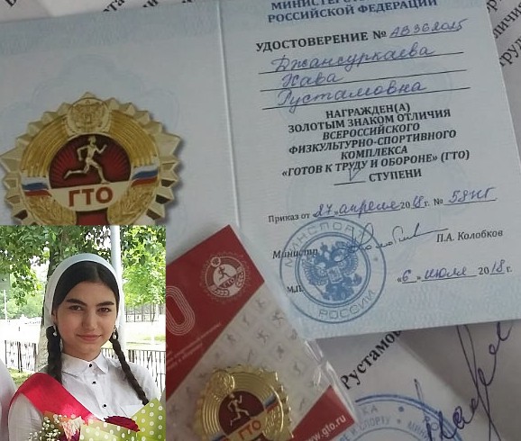Министр спорта России Павел Колобков подписал очередной Приказ «О награждении золотым знаком отличия Всероссийского физкультурно-спортивного комплекса «Готов к труду и обороне». В приказ вошли граждане, успешно выполнившие испытания комплекса ГТО по итогам тестирования с 1 апреля по 30 июня 2018 г. В этом списке ученица 11 класса МБОУ «СОШ №47» Джансуркаева Хава.